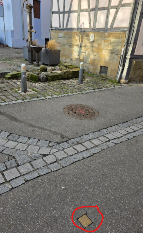 Folgt ihr seinem Blick und geht 15 Meter in diese Richtung, findet ihr den goldenen Stein. Der goldene Stein ist ein sogenannter „Stolperstein“, der zum Andenken an die deportierten Juden im Boden eingelassen wurde. Er befindet sich in der angegebenen Richtung schräg gegenüber vom Brunnen.