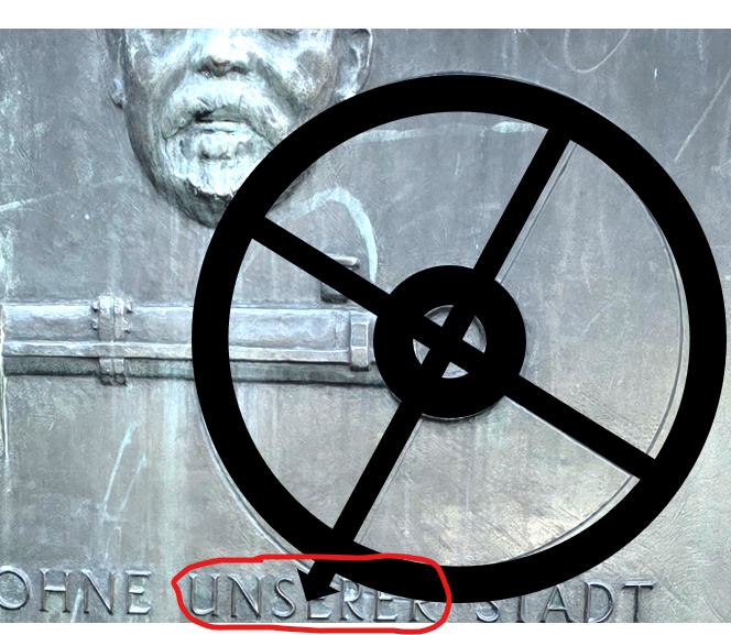 Legt man die Grafik auf das Abbild der Maschine, zeigt der Pfeil auf das Wort „Unserer“.